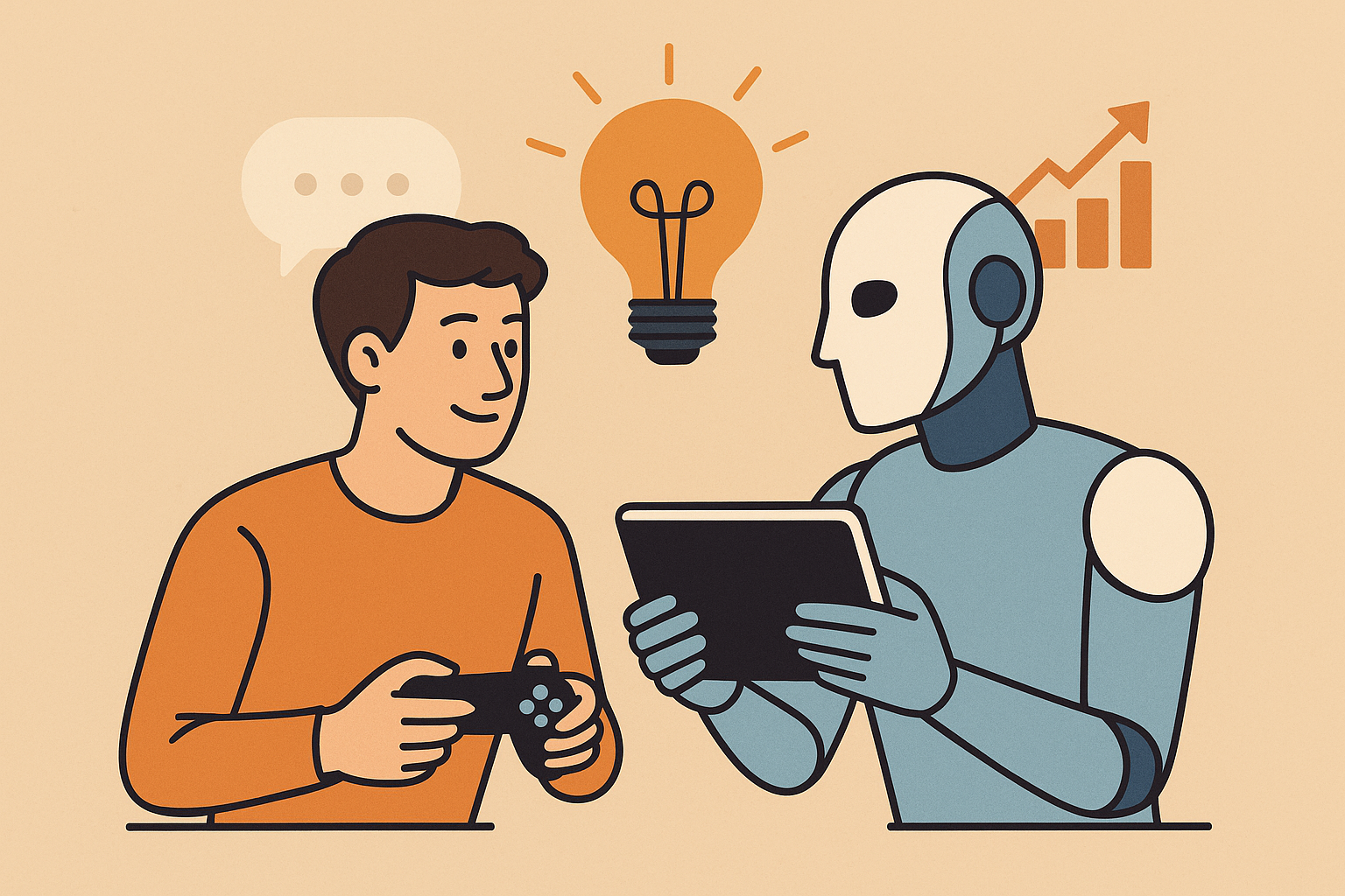 Bu illüstrasyon, yapay zekâ ile insan zekâsının birlikte üretim yaptığı yeni iş modellerini simgeliyor. İletişim, yaratıcılık ve veri güdümlü karar alma gibi alanlarda yapay zekânın yükselişi, insan yetenekleriyle birleştiğinde iş süreçlerinde dönüşüm sağlıyor. Görsel, insan ve robot arasındaki iş birliğini sembolize ederek hibrit zekâ kavramını vurguluyor.