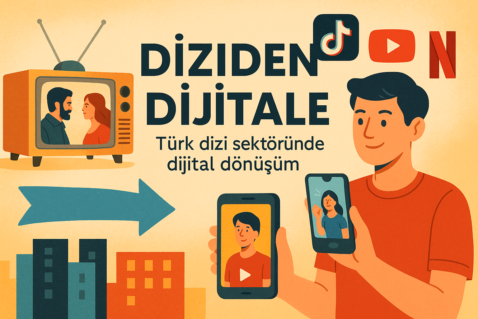 Bu görsel, Türkiye’deki dizi ve medya sektörünün dijital dönüşümünü yansıtmaktadır. Geleneksel televizyon formatları yerini YouTube, TikTok ve Netflix gibi dijital platformlara bırakırken, kısa video formatları, dikey içerikler ve sosyal medya dizileri yeni bir izleme alışkanlığı yaratıyor. Görseldeki simgeler, izleyici davranışlarının ve içerik üretim biçimlerinin nasıl değiştiğini anlatmakta; hem sektör profesyonellerine hem de izleyiciye bu değişimi anlatan güçlü bir görsel temsil sunmaktadır.