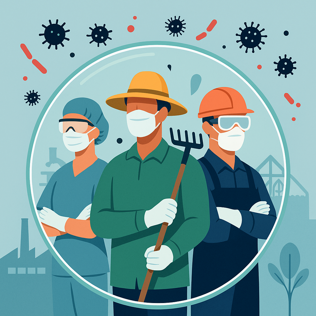 Bu illüstrasyon, sağlık, tarım ve sanayi sektörlerinde çalışan işçilerin biyolojik tehlikelere karşı koruyucu ekipmanlarla donatıldığını ve şeffaf bir kalkanla virüs, bakteri gibi görünmeyen tehditlere karşı korunduğunu betimliyor. Görsel, ILO’nun 192 No’lu Sözleşmesi kapsamında çalışanların sağlığını güvence altına alan uluslararası standartlara vurgu yapmaktadır.
